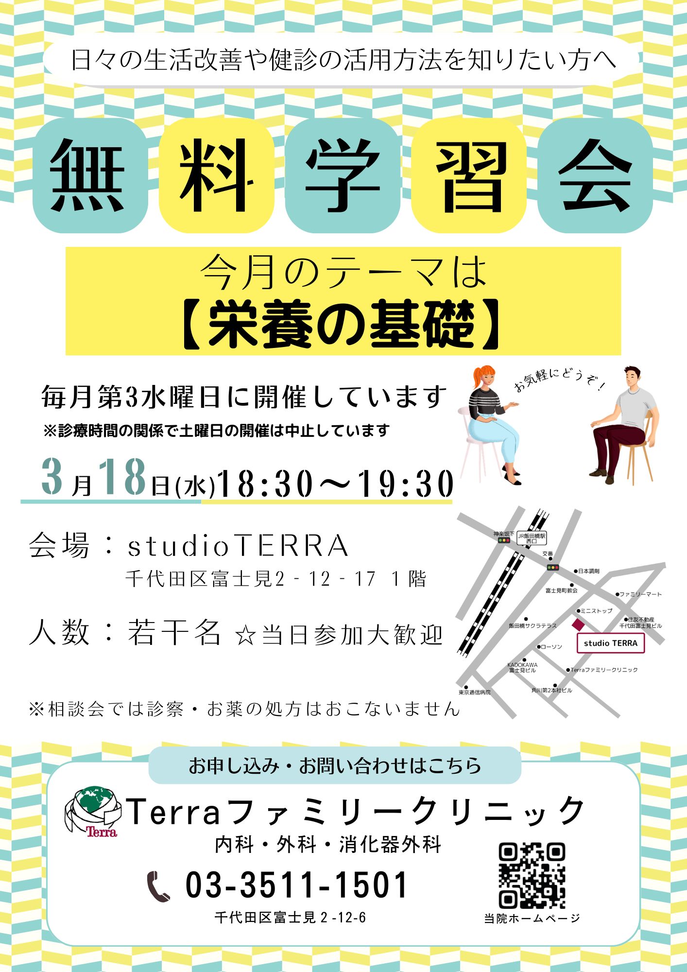 無料学習会のお知らせ \無料学習会のお知らせ📢/今月のテーマ:「栄養の基礎」医師が60分でわかりやすく解説し、後半は質問コーナーもあります。 参加方法 お電話(03-3511-1501)に連絡ください。ご家族・ご友人の同伴も大歓迎です☺️ お気軽にどうぞ! Previous